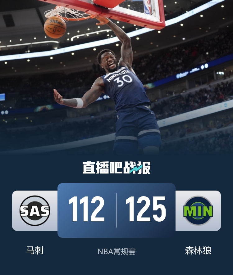 首节对决马刺抢占主动权开局取得微弱优势领跑,森林狼这一节同样保持着不错的攻势单节拿下31分,但防守端无力阻止对手导致一直被动追分;次节马刺在拉锯战中一度拿到两位数领先,不过后半段没能顶住压力,森林狼依靠克拉克的连续三分追至1分进入下半场。休息归来双方依旧拉锯,马刺凭借节中10-2的攻势稍占上风;然而末节风云突变,一直保持优势的马刺长达8分钟里仅得7分,森林狼轰出25-7的攻势直接扭转局势建立起两位数领先杀死比赛。最终,森林狼主场击退马刺收下比赛。